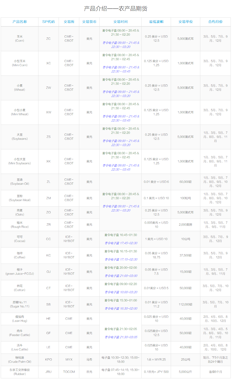 农产品是最早构成期货交易的商品。包括: 1、粮食期货,主要有小麦期货、玉米期货、大豆期货、豆粕期货、红豆期货、大米期货、花生仁期货等等; 2、经济作物类期货,有原糖,咖啡,可可,橙汁,棕榈油和菜籽期货; 3、畜产品期货,主要有肉类制品和皮毛制品两大类期货; 4、林产品期货,主要有木材期货和天然橡胶期货。 美国各交易所,尤其是芝加哥期货交易所(CBOT)是农产品期货的主要集中地。
