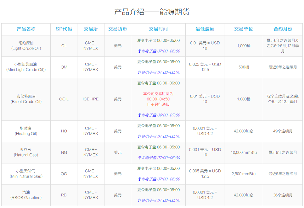 能源期货(Energy Futures)包括原油及其附属产品的燃油、汽油等,及其他能源如丙烷、天然气等期货。原油是全世界使用率最高的能源,至少短期之内无任何能源可取代其地位。一般原油大部分的产量都集中在中东地区,所以原油价格波动易受到石油输出国组织(OPEC)对于石油产量决议的影响,但美国为原油的使用大国,故对原油价格波动仍具相当大的影响力。目前全世界最大的能源期货交易所为美国纽约商业交易所(NYMEX)。