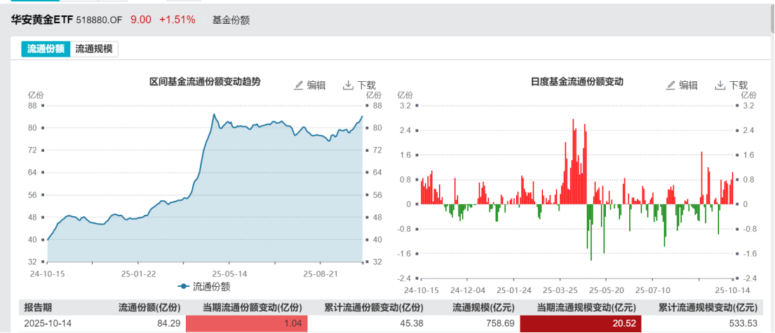非货ETF市场上,黄金ETF本月以来涨幅领跑,仅过去6个交易日,累计涨幅已经超过10%,今年累计涨幅多超过50%。申购基金份额的步伐也并未停下,规模自然也持续新高。