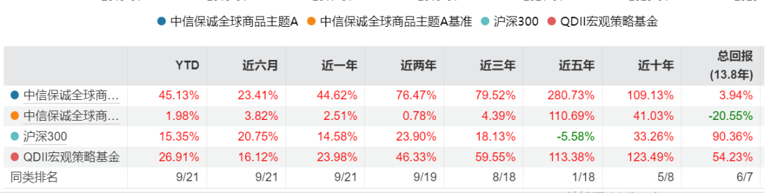比如,中信保诚全球商品主题LOF近5年净值回报为280.73%,领先市场,年内净值也上涨了45.13%。从持仓来看,该基金在二季度全面加大了黄金主题ETF的仓位,至二季度末,重仓基金均为黄金ETF,此前的原油主题ETF退出重仓行列。