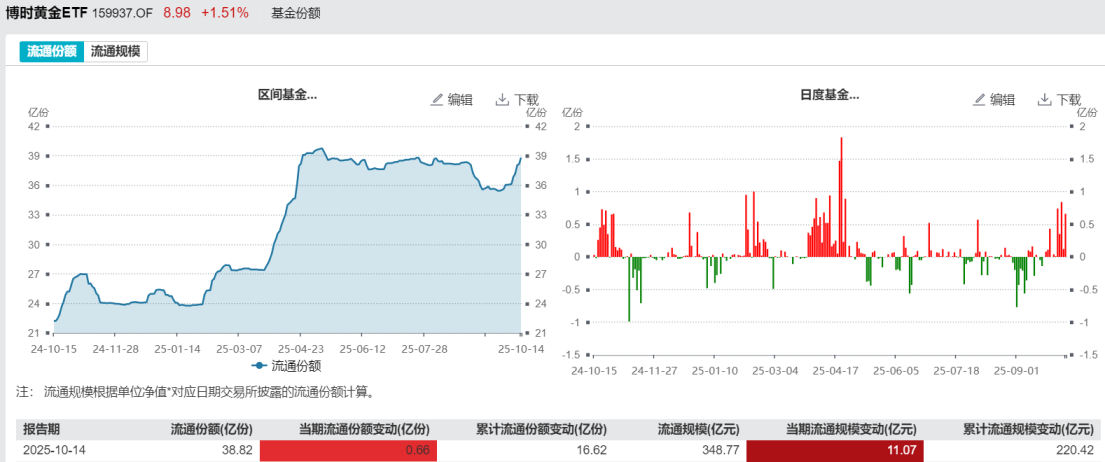 此外,博时黄金ETF的规模也在年内突破300亿元关口,至目前的349.1亿元,易方达基金、国泰基金旗下的黄金ETF最新规模也超过200亿元。